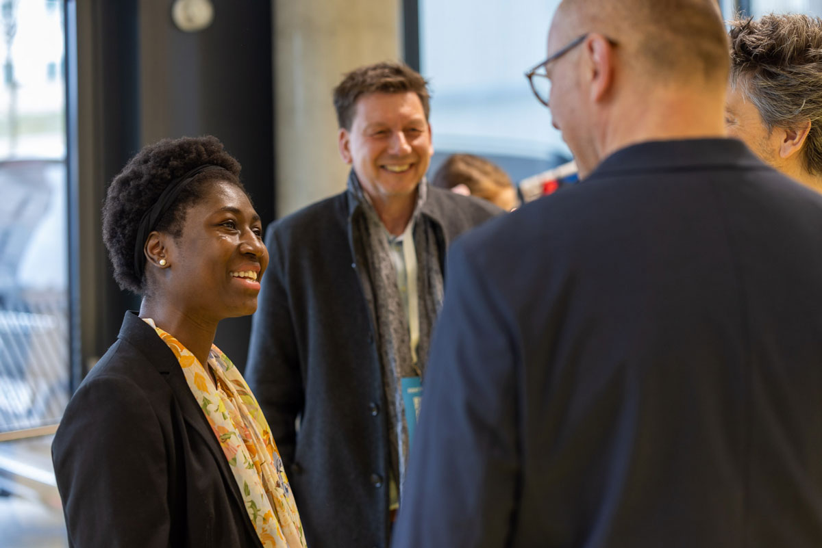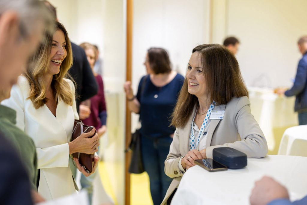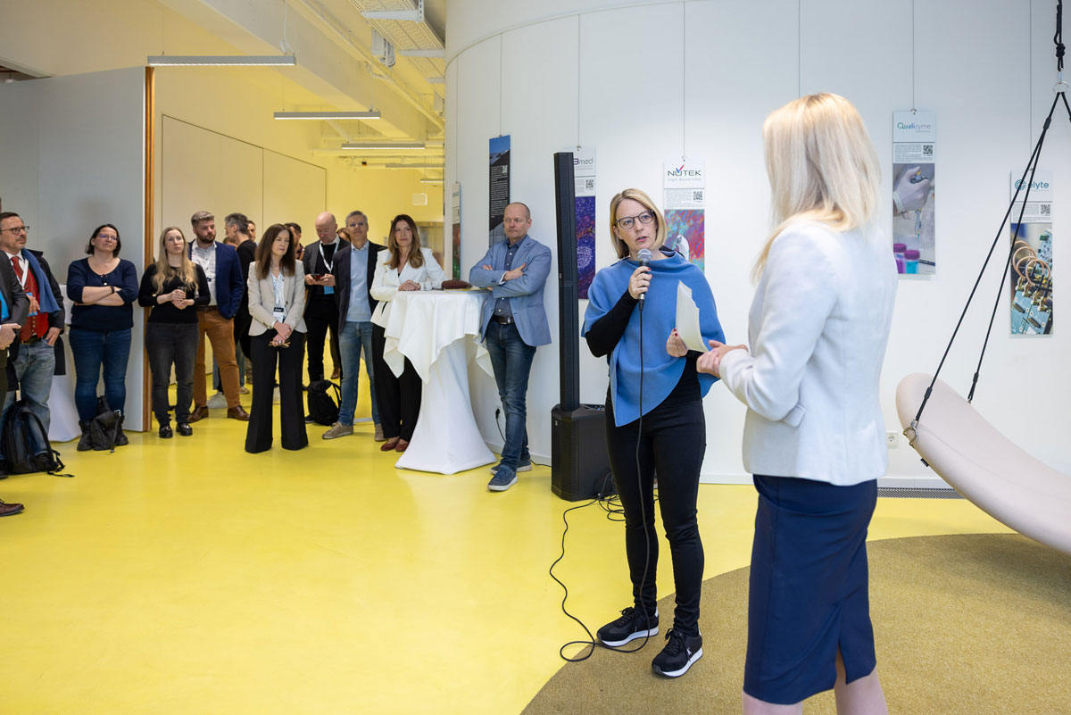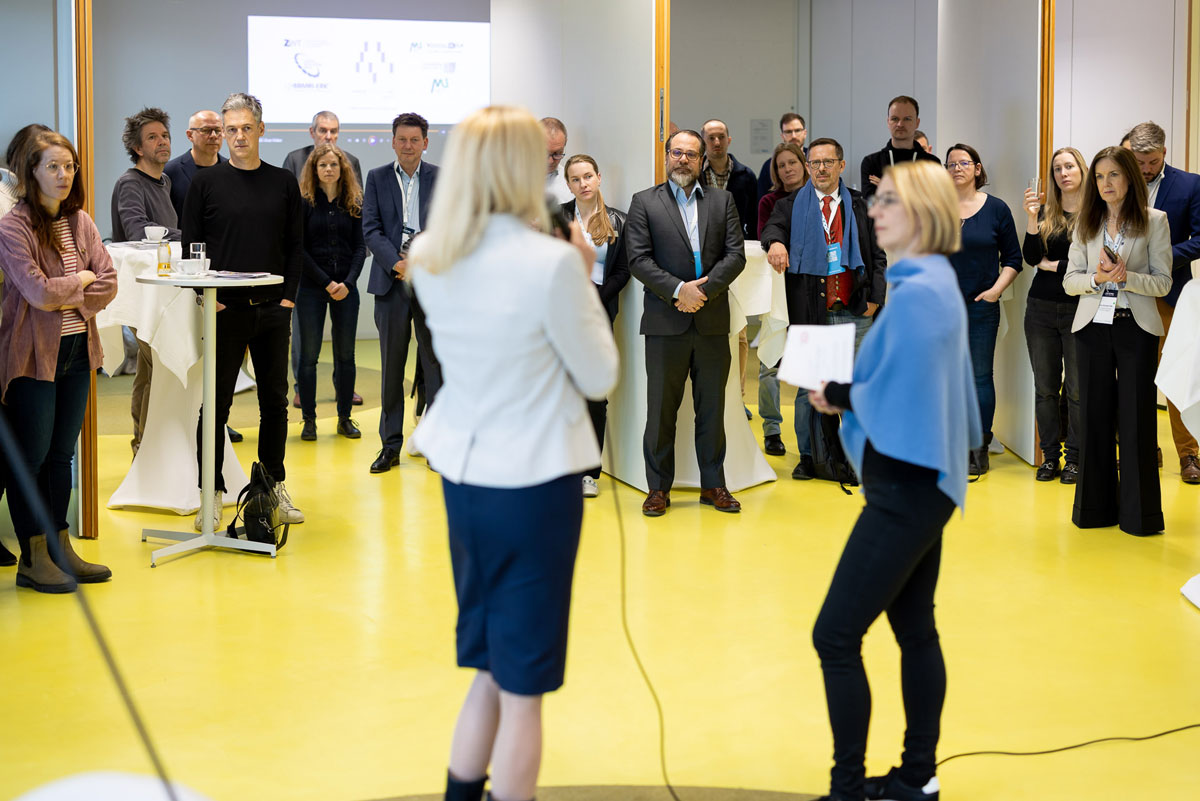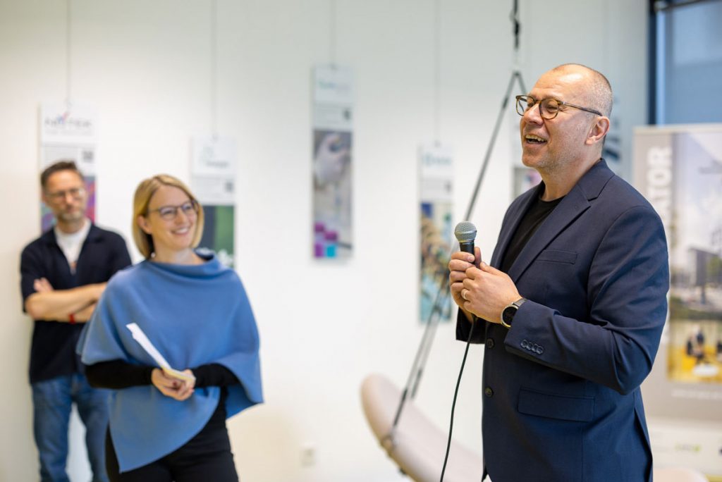 Zahlreiche Teilnehmer:innen des HTH nahmen die Gelegenheit wahr, den zweiten Tag mit einem Netzwerkfrühstück im ZWT zu beginnen. Dabei wurde nicht nur heißer Kaffee serviert, sondern auch Einblicke in sehr unterschiedliche Forschungsthemen, Entwicklungen und Möglichkeiten zur Unterstützung von Forschenden. Nach einem Überblick über das ZWT und seine Mieter:innen von ZWT-Geschäftsführerin Anke Dettelbacher stellte ZWT-Geschäftsführer Thomas Mrak das Pre-Seed-Projekt vor, das potenzielle Gründungen im Bereich Life Science am Standort fördert.